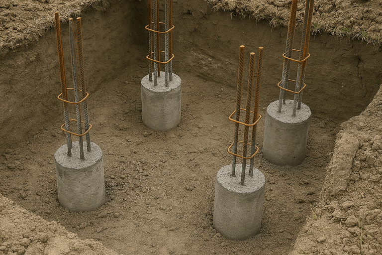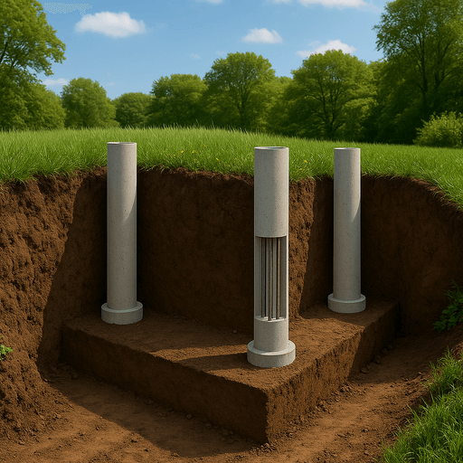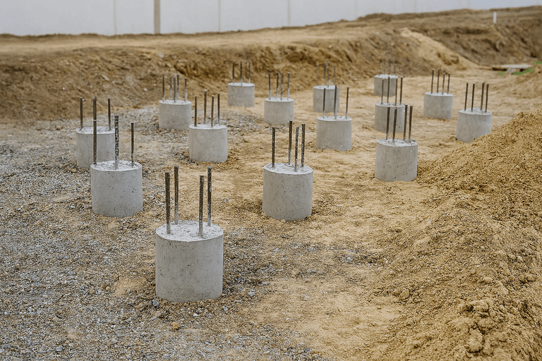 Фундамент на буронабивных сваях — это надежное решение для сложных грунтов и участков с перепадами высот. Он подходит как для компактных, так и для просторных объектов. Ниже описаны основные этапы устройства фундамента на буронабивных сваях с ростверком, которые мы осуществляем с соблюдением СНиП и современных инженерных норм.